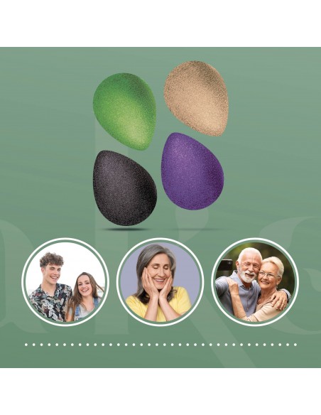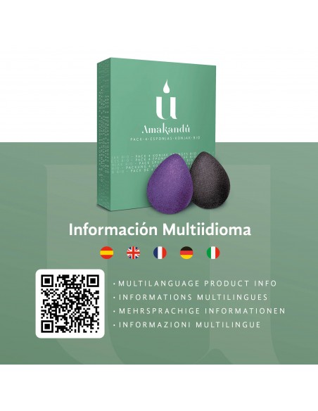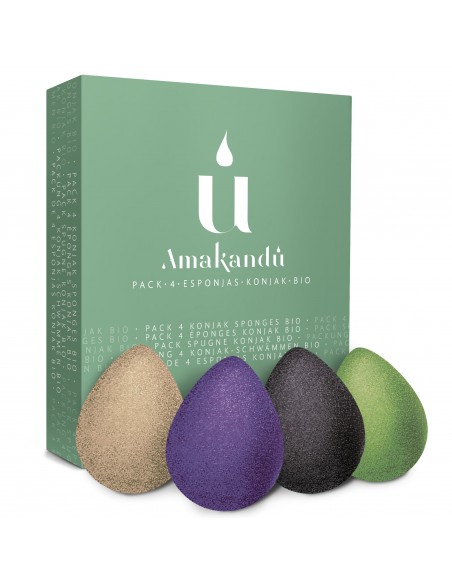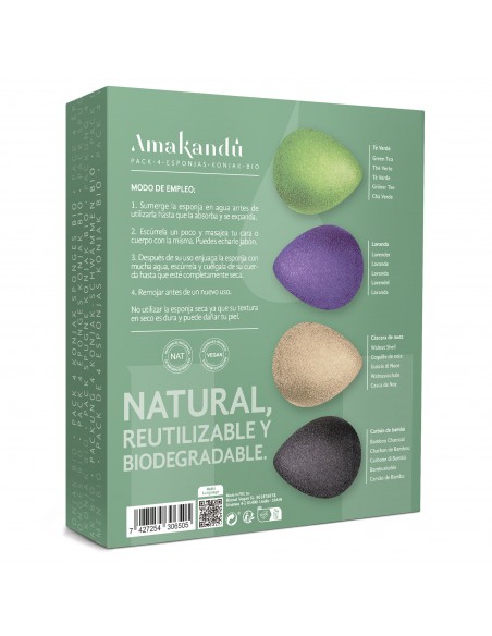 Pack de 4 esponjas vegetales de Konjak BIO: té verde, carbón vegetal, lavanda y cáscara de nuez. Tamaño esponja en seco grande: 9cm x 7cm