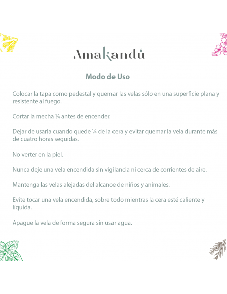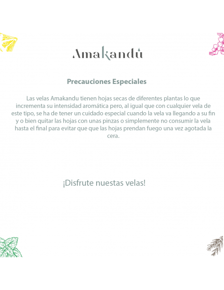 PRECAUCIONES ESPECIALES: Las velas Amakandu tienen hojas secas de diferentes plantas lo que incrementa su intensidad aromática pero, al igual que con cualquier vela de este tipo, se ha de tener un cuidado especial cuando la vela va llegando a su fin y o bien quitar las hojas con unas pinzas o simplemente no consumir la vela hasta el final para evitar que que las hojas prendan fuego una vez agotada la cera. ¡Disfrute nuestas velas!
