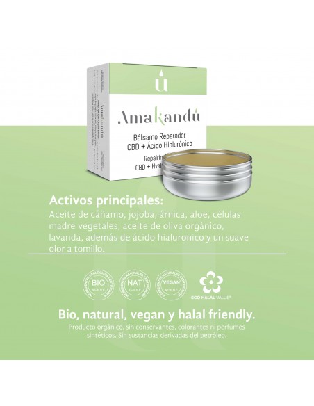 Bálsamo a base de ingredientes orgánicos, naturales y de alta calidad como el aceite de cañamo, jojoba, arnica, aloe, células madre vegetales, aceite de oliva orgánica, lavanda y mucho más, con suave aroma natural a tomillo sin perfumes ni ningún ingrediente químico.